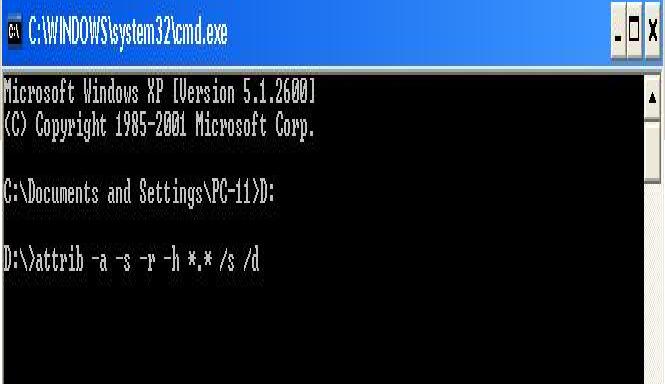 Setelah itu baru ketikkan perintah berikut : attrib -a -s -r -h *.* /s /d (lalu enter). Tunggu sebentar sampai muncul kembali ke tanda prompt drive Anda.