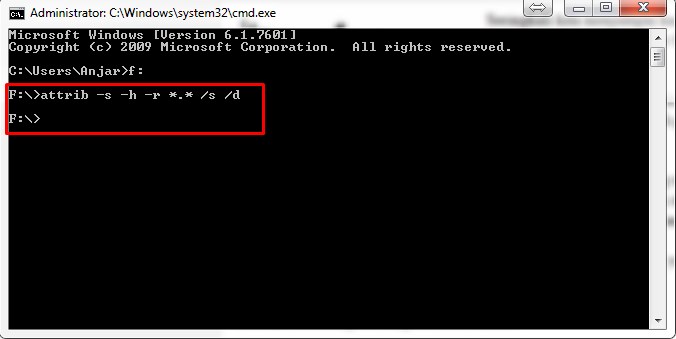 - Selanjutnya ketik perintah attrib -s -h -r *.* /s /d lalu tekan enter.